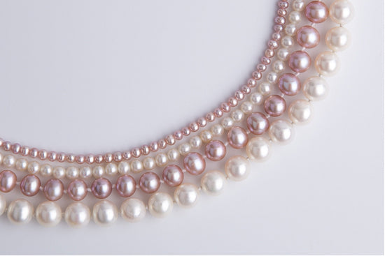 An average Akoya pearl is 7 mm; Akoya pearls are currently being harvested in sizes from as small as 1 mm up to the very rare 10-11 mm; both mini and jumbo sizes are rare and sought after. Akoya pearls usually come with a pink, white, or silver overtone. Many customers think of white or cream-colored Akoyas as the classic pearl used for jewelry, especially single-strand necklaces.